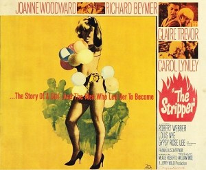 THE STRIPPER, not a salacious expose like its misleading title would indicate, but another one of those American Gothic downers about lonely, aging women, written by inner-self-projecting gay men, this time set in the repressed Midwest instead of the steamy South, conjured by William Inge rather than Tennessee Williams. 20th Century Fox production head Buddy Adler, betting on a hit like Inge’s Picnic and Bus Stop, plunked down $400,000 for the rights to his 1959 play “A Loss Of Roses” even before it opened on Broadway. That much green would be about $4,338,000 in 2025 (wait ’til next year). Oops, Buddy, the play closed after twenty-five performances. Initially the property was scoped as a vehicle for Marilyn Monroe and Pat Boone (stop laughing); they both turned it down. When it finally went out in 1963 Joanne Woodward had the trapped-in-life’s-amber role of the sort previously put under the melodrama microscope by the flamboyant likes of Vivien Leigh, Anna Magnani and Geraldine Page. A good choice. Unfortunately, rather than being pawed over/brought back to life/discarded by territory scouts Marlon Brando or Paul Newman, the extra dose of man misery was tooth-pasted on by the earnestness-on-display of Richard Beymer. “Next!” *