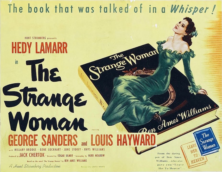 THE STRANGE WOMAN is Hedy Lamarr, vamping up a storm of man-eating mischief as the title vixen. Dangerously beautiful Hedy’s most famous Holly-roles were as native temptress ‘Tondelayo’ in 1942’s White Cargo and the immortal Biblical beeyatch in 1949’s Samson And Delilah. Smack in the middle was schizoid ‘Jenny Hager’ in this 1946 melodrama. As one of her used & discarded conquests blubbers “She’s so rotten. She’s not even a human being!” Left hanging is the question posed to the men in the audience “But would you sleep with her?” Duh.