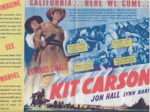 In the mid 1840’s trapper, scout and Indian fighter Carson (Jon Hall) and boisterous pals ‘Ape’ (Ward Bond) and ‘Lopez’ (Harold Huber) escape from a Shoshone ambush and make their way to Fort Bridger, a far-flung outpost in what is now Wyoming. There they join up with a wagon train headed to California (then held by Mexico) under the command and protection of ambitious US Army Captain John Fremont (Dana Andrews). Since the script carries the standard interjection of a romance element, there’s Lynn Bari as ‘Dolores Murphy’, a fictional someone for Carson and Fremont to fuss over between battles.