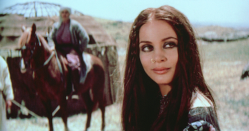 Afghanistan—before the Soviet/Taliban/American/Taliban catastrophes. Tribal, feudal, tradition-bound, the ancient national sport is as rugged as the landscapes: buskashi, polo with a goat carcass as the object to clash over. Riding ‘Jahil’, his father’s prize white stallion, ‘Uraz’ (Sharif, 37) suffers a badly broken leg during a crucial match in the capital Kabul. Discarding the cast ‘modern’ doctors applied to his injury, a festering boil of pride, bitterness and unbending will sends him trekking home on a dangerous track thru the Hindu Kush. On the journey Uraz and his loyal servant ‘Mokkhi’ (Srinanda De) encounter the ‘unclean’ nomad outcast ‘Zareh’ (Leigh Taylor-Young, 19), and after some sparring adjustment the three forge ahead, the worth of the stallion binding them. In the rural northern province that is their destination waits ‘Tursen’ (Jack Palance), the father of Uraz and leader of their clan, a man who in his youth was a legendary buskashi champion.