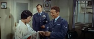 It was a strong showing from Garner, 28, his second year in the business also marked by starting TVs Maverick: one year later he drew his first lead in a feature with Darby’s Rangers. He comes across with easy, unforced naturalism. The casting of Montalban always gets pasted, simply because “he’s Ricardo Montalban and not Japanese”, but the makeup is subtle and there’s nothing lacking in his sincere performance. Kent Smith does all right as the string-pulling ‘Gen. Webster’, but it’s rather a stretch to accept a general be so spineless. With the commendable work from all the above it’s odd that the weak link comes from the star. Some praise Brando’s work in this (and he drew his 5th Oscar nomination) but we’re in the minority: the corn pone Southern accent he chose feels purely arbitrary, he’s so mannered it’s practically a Brando imitation; he does everything but pick his nose. To play fair, one example of a Brando performance that was unfairly pilloried was in the 1962 remake of Mutiny On The Bounty. We thought he was excellent in that epic, and steadfastly defend him there, but we can’t buy him for a minute in Sayonara. The character went to West Point yet Marlon mumbles him like a refugee from Dogpatch. The story is so viable and the rest of the production is solid enough to make up for it.