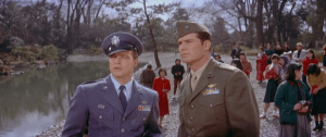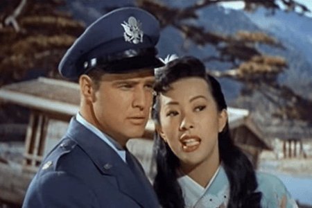 ‘Lloyd Gruver’ (Marlon Brando) is a Major in the US Air Force, nicknamed ‘Ace’ for his combat victories as a fighter pilot in the skies over Korea. He’s bound for promotion and a career in the service, and gets a push in that direction when the General father of his fiancée ‘Eileen Webster’ (Patricia Owens) has him reassigned to a base in Kobe, Japan, where Eileen shows up for a visit. Lloyd’s crew chief , enlisted airman ‘Joe Kelly’ (Red Buttons) is also ready for marriage, in his case to ‘Katsumi’ (Miyoshi Umeki), a local Japanese. The military frowns on fraternization, but despite the guarantee of enforced separation, Kelly is adamant and asks Lloyd to be his best man. Skeptical, Gruver agrees, but when he meets traditional dancer ‘Hana-ogi’ (Miiko Taka) he becomes enamored with her, which not only brings his planned marriage to Eileen to a halt, but jeopardizes his shoo-in career. Pressure from the Air Force is relentless, and there is also resentment from many Japanese toward the Americans dating from the previous war and their own prejudices. Gruver’s buddy Marine Captain ‘Mike Bailey’ (James Garner), also involved with a Japanese woman, is sympathetic, and an added twist comes when the dejected Eileen meets lauded Kabuki performer ‘Nakamura’ (Ricardo Montalban) and the two develop feelings for one another.