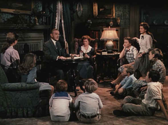 In the 1920’s Frank (Webb, 60) and Lillian (Loy, 45) raise twelve children in their homes in Providence, Rhode Island and Montclair, New Jersey. Jeanne Crain (25, playing 17) is eldest daughter Ann. The only other kids with much screen time are played by Barbara Bates (24, playing 15), Jimmy Hunt (10, of Invaders From Mars fame), Norman Ollestad (14, he became an FBI agent) and Carol Nugent (12, she married Nick Adams).