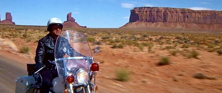 In his first and only go at directing, 28-year-old music producer James William Guercio tried to learn on the job, not always advisable when you intend to share the results in public. He was also the producer—he managed the band Chicago (several members appear in the movie); Blake later claimed that he and cinematographer Conrad Hall did much of the directing, but taking flaky Blake’s word on something is like trusting a politician. Hall’s work is solid, with some great captures of the wide open Arizona landscapes and coverage of the motorcycle action, especially of the gnarly stunts in a absurd chase sequence. That violent, casualty counting insertion was done in Victorville, California, with most of the rest of the film shot around towns near Phoenix. But for the sake of dramatic license, message’y portent and as a nod to John Ford westerns, Monument Valley is prominently showcased: never mind that it’s over 300 miles away from Phoenix. Guercio also wrote a gawdawful song that closes out the movie, bleating a full seven minutes in the longest draw-back-the-camera-slow-ly-and-feel-the-meaning shot this side of Andy Warhol’s ode to the Empire State Building. The screenplay came from Robert Boris (Doctor Detroit, retch) and Rupert Hitzig; it shares blame for the drama-class speeches and clubfooted attempts at humor.
