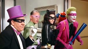 It looks like everyone had a good time, overacting up a bat-storm. The show’s iconic stars (Adam West and Burt Ward) and supporting regulars (Neil Hamilton, Alan Napier, Stafford Repp and Madge Blake) join face off against Meriwether’s purring vixen and classic villains the ‘Joker’ (Cesar Romero), the ‘Penguin’ (Burgess Meredith) and the ‘Riddler’ (Frank Gorshin). Nelson Riddle did the energetic scoring, making sure Neal Hefti’s immediately identifiable theme from the series gets in some licks. Leslie H. Martinson (tons of TV plus The Atomic Kid, PT-109 and Fathom) directed, Lorenzo Semple Jr. (Pretty Poison) wrote the script, which has the forces-joined quartet of supervillains wreaking comic-book havoc with a dehydrator that can turn people to dust. In addition to the Batmobile, the Dynamic Duo deploy the Batcycle, Batboat and Batcopter. “Bam! Kapow! Thwonk!” Harmless, nostalgic camp smiles for 104 minutes, with Reginald Denny, Milton Frome, Teru Shimada, Ivan Triesault and Harry Lauter.