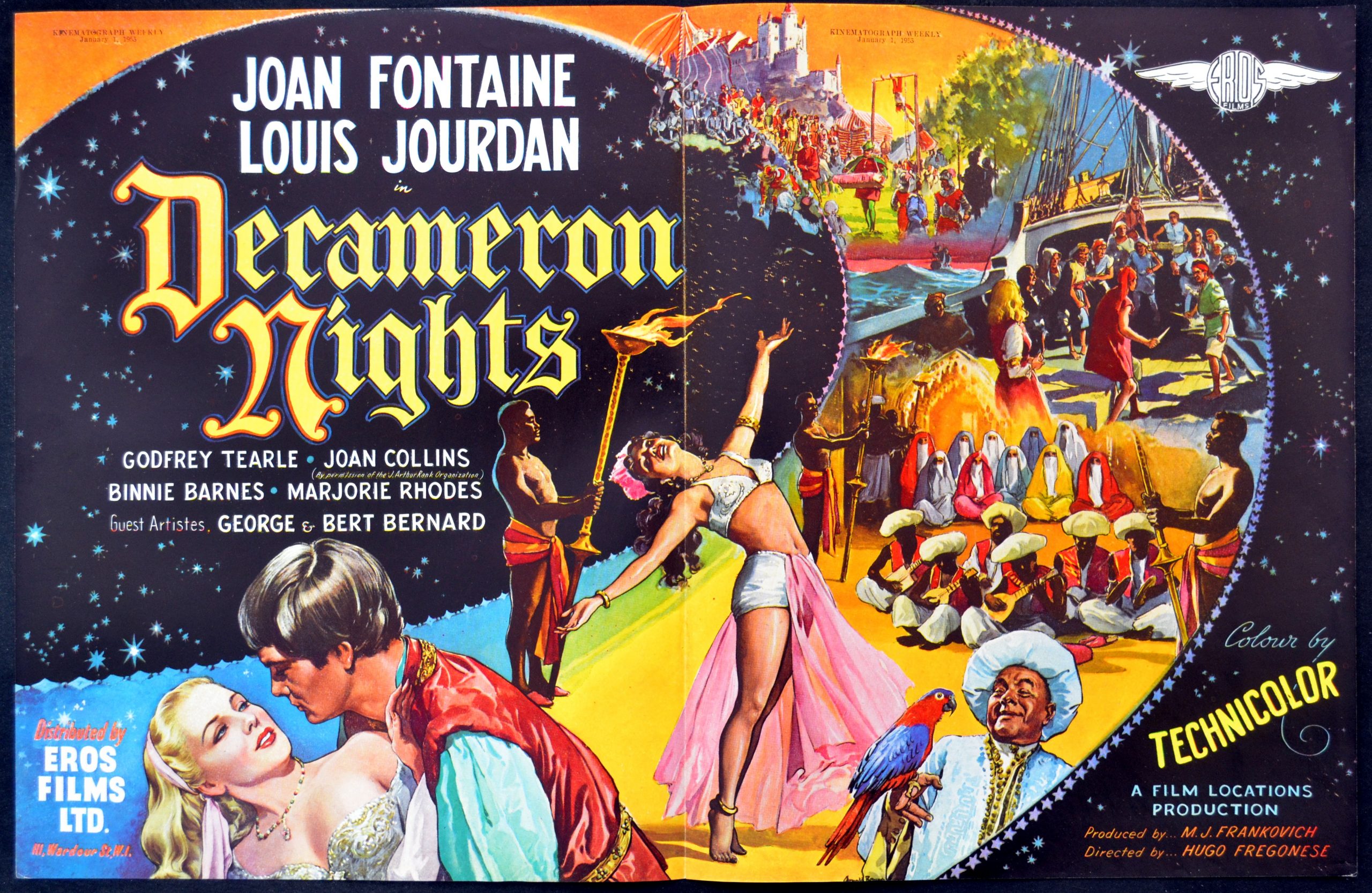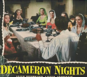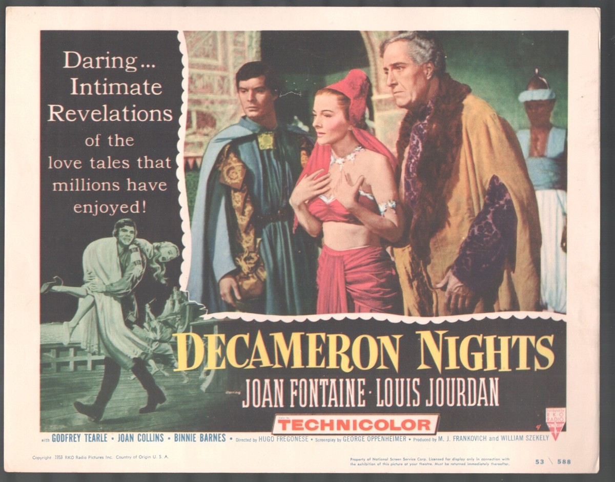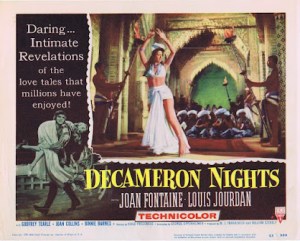 DECAMERON NIGHTS, a British-American co-production from 1953, is a triptych of three humorous tales adapted from Giovanni Boccaccio’s collection of 100 short stories in his medieval opus “The Decameron”. Hugo Fregonese directed on location in Spain and Italy, with the lead roles taken by Joan Fontaine and Louis Jourdan. They’d been paired to acclaim in 1948s classic drama Letter From An Unknown Woman; here their sexual fencing is playful, backed up with a crew of mostly English supporting actors, including 19-year-old beauty Joan Collins. *