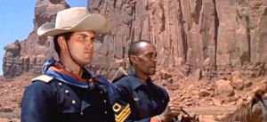 The screenplay from James Warner Bellah and Willis Goldbeck (with definite input from Ford) deserves credit not just for bringing to screen the historical presence of the African-American soldiers who served with distinction in the West (and beyond) but for tangling with the miscegenation fear that permeated the national fabric from way back and still held sway in many parts of the country as it entered the promise of the 1960’s. The framework (courtroom theatrics, flashbacks to factor in some needed action scenes, the romantic angle dross with Hunter & Tower) is unwieldy. Scenery is provided by Monument Valley, naturally, because it’s a Ford western. **