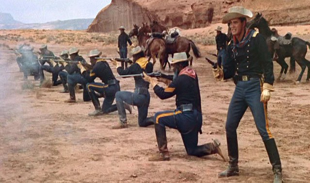 Movie lore always mentions Ford’s “cavalry trilogy” (1948’s Fort Apache, She Wore A Yellow Ribbon in 1949 and Rio Grande in 1950) but you could actually up that to six, with 1959’s The Horse Soldiers, then Sergeant Rutledge and finally Cheyenne Autumn in 1964. “Bugler, sound recall”—he also had the “bluecoats” briefly figure into Stagecoach (Old School saving the day) and The Searchers (not coming off nobly there, wiping out an entire village).