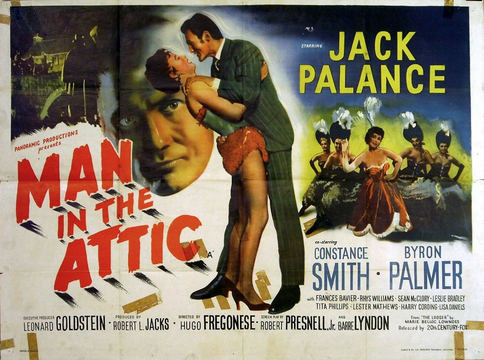MAN IN THE ATTIC is our old fiend Jack the Ripper, in the fourth movie adaptation of Marie Belloc Lowndes 1913 novel “The Lodger”. Hitchcock did a silent version in 1927, his first thriller. The incredibly prolific Maurice Elvey (197 directorial credits) made the earliest sound go in 1932, John Brahm staged the best regarded venture in 1944. Those first three kept the title The Lodger. This modestly budgeted entry from 1953 switched up the marquee grabber but re-used the script Barré Lyndon wrote for the ’44 version; the return visit shares the chore with Robert Presnell Jr. This time around direction was entrusted to Hugo Fregonese, who steered a number of good B-pictures in the early 50’s (My Six Convicts, Decameron Nights, The Raid, Black Tuesday); helped by his cameraman and the composer he does well in the atmosphere department, but the retreaked script shorts out, key supporting players are bland and suspense jumps out the window seven minutes in as soon as Jack Palance comes on screen. Gee, who do you think Jack will turn out to be? *