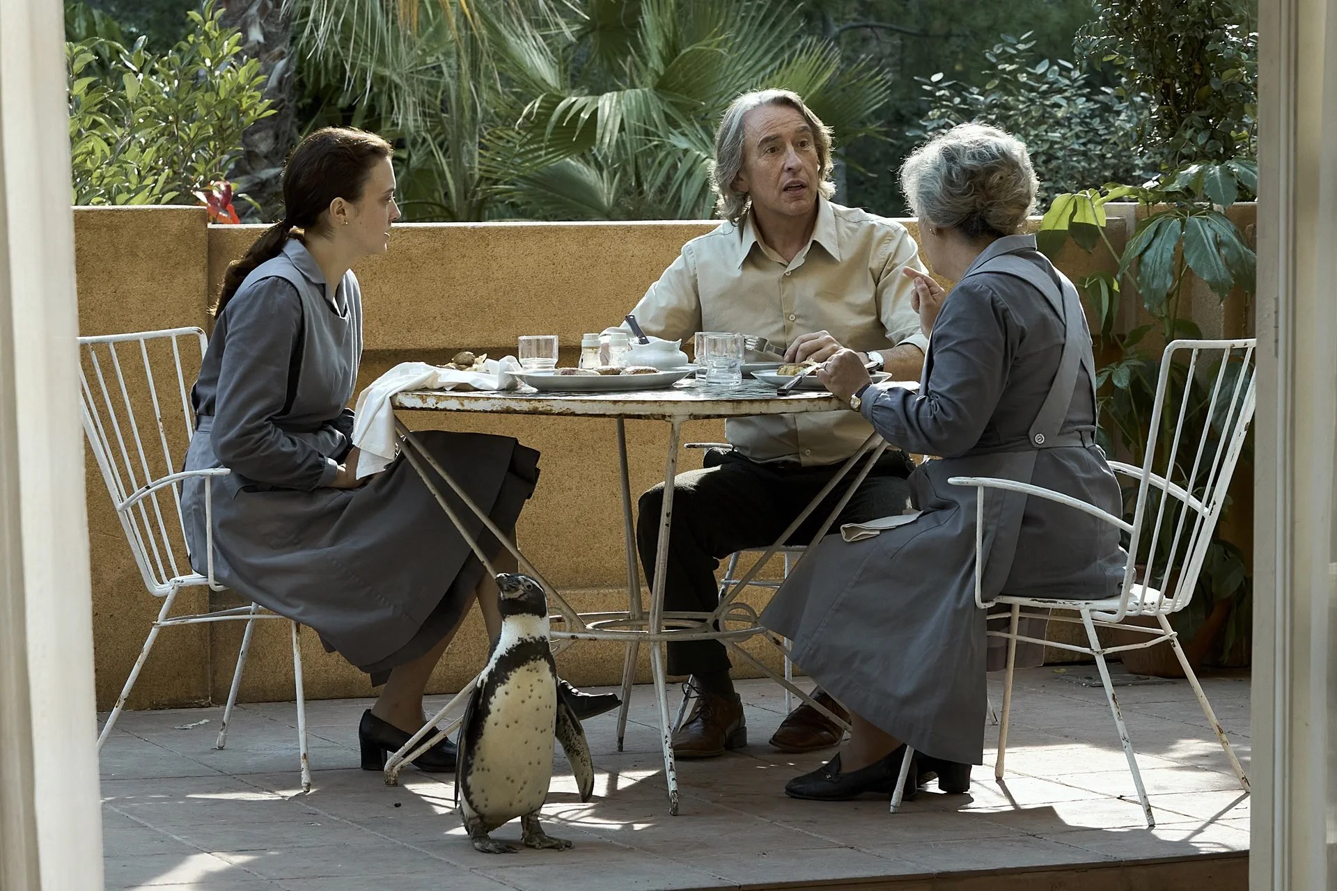 Buenos Aires, 1976. Brit ex-pat Tom Mitchell (Steve Coogan) gets hired to teach English and poetry and maybe coach rugby to the rowdy lads at exclusive St. George’s College. He’s not a happy camper to start with, and is further dismayed by the boys bratty attitudes and behaviors. On a beach escape to Uruguay, Tom and a woman he meets at a club rescue a penguin from an oil slick, the sole survivor of its colony. Hooking up with ‘Carina’ (a nice turn from Micaela Breque) doesn’t pan out, but the critter refuses to go back to the sea, and follows Tom like a homing pigeon, er, penguin. He takes ‘Juan Salvador’ back to his apartment and then to school. The students are amused, the Headmaster ( Jonathan Pryce) isn’t. Tom and his problematic pal bond with housekeeper ‘Maria Alvarez’ (Vivian El Jeber, 60) and her granddaughter ‘Sofia’ (Alfonsina Carrocio, age?, in the script she’s nineteen). That’s all well and good, except for the salient fact that Argentina is under a right-wing military dictatorship: Sofia is a leftist (as in humane and democratic), and the brutally repressive government knows who talks to whom about what, when & where. Tom’s avoid-trouble philosophy and fear of commitment faces harsher truths and tougher choices than what fish to feed his pet.