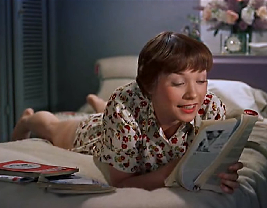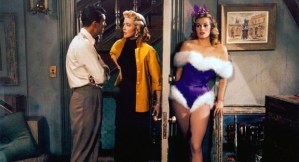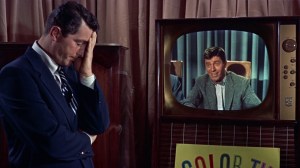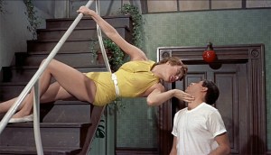 Effortlessly alluring as she is, the real ‘find’ in the freewheeling is pixie-with-sizzle MacLaine, 21, in her second part, after debuting in the same year’s The Trouble With Harry. She’s a natural, cute (the brassy shrieking Shirley was down the road, as was the star voyager/past lives sermonetteress), quick, facile and with dancer’s limbs to pine for. Her showpiece number comes after Dean croons “Innamorata” (it became a chart hit) while mooning over Malone. The sequence shifts to MacLaine doing a goof version of the tune,’seducing’ clueless Lewis on a staircase; it’s a physical comedy gem. Throughout the show, shot in VistaVision so clear you can count the freckles on Shirley’s back, veteran cartoonist Tashlin’s gift for gloriously garish color palettes makes even the most ordinary scene a visual treat whether you respond to the jokes or not.