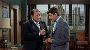 Roommates and eternal pals ‘Rick Todd’ (Martin) and ‘Eugene Fullstack’ (Lewis) each have artistic bents. Smooth cat Rick is a struggling painter (favoring, uh, form), while perpetual adolescent Eugene dreams up children’s stories and is crazoid for wacky comic books. Their apartment neighbors include professional artist ‘Abigail Parker’ (Dorothy Malone, major sigh…) and ‘Bessie Sparrowbush’ (Shirley MacLaine, kicking out the gams), her roomie, model for Abigail’s cartoon heroine ‘Bat Lady’ and also her co-worker for ‘Mr. Murdock’ (Eddie Mayehoff), the head of ‘Murdock Publishing’, specializing in the sort of lurid, violent comix that thrill America’s kids and outrage parents, preachers and politicians. The pheromonal guys & gals pursue one another (cheesy chasing cheesecake)—and then those cursed Commie’s horn in. They sic seductress spy ‘Sonia’ (Eva Gabor) on the boys after one of Eugene’s fever-baked ideas includes a rocket formula that accidentally duplicates our Air Force’s actual top secret gizmo. Add songs, dances and Anita Ekberg—in case there wasn’t enough sexual innuendo from Dorothy, Shirley and Zsa Zsa’s sister.