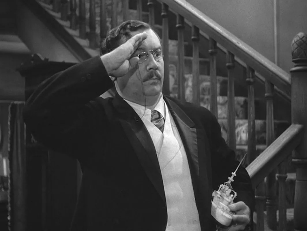 Great setup, top talent in front of & behind the camera. Yet key pieces don’t fit, and the handling repeatedly fails to make them do so. His skills and charm pulled off many a hit, but Cary himself acknowledged the occasional dog (The Howards Of Virginia, Night And Day, Kiss Them For Me) and he regarded this as his worst performance, one in which he was unhappy throughout by being pushed by Capra to ‘go big’. He’s forced from Scene One on, so ceaselessly loud and rabbity it comes off like someone fried on coke doing an impression of Cary Grant. The stage idea of Karloff having fun “playing Karloff” dies with Massey, not an actor attuned to a light touch, his Jonathan is so sinister it unbalances the farcial gimmick. Alexander can’t be faulted for his playing of Teddy as Teddy but two rushes upstairs after bellows of “CHARGE!” would suffice—seven run the gag down San Juan Hill into the swamp. Usually adept at precision mugging, Carson is also tasked to overdo it. Lane is colorless. Grant pleaded for retakes but the studio nixed it when Capra went off to enlist after Pearl Harbor.