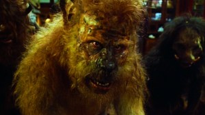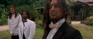 And yet, hold the hybrids! If you persevere and paddle past the wreckage, there’s still a good deal of cool stuff to enjoy. From the jolting title credits (designed by Kyle Cooper) to the smithereens wrap up, William A. Fraker’s lush cinematography rates as prime cut. The unsung Gary Chang does well by his scoring, not succumbing to the lazy route of portentous bombast. The superb creature design from Stan Winston and Shane Mahan brings lavishly updated and refined craftsmanship to the legacy of unease created from the earlier versions, bolstered by outstanding work from the sound effects team. Under their makeup, actors Temuera Morrison, Daniel Rigney and Ron Perlman emerge with honor. And 21-year-old Fairuza Balk acts rings around the big stars, showing up the crash indulgence of Brando and Kilmer and the miscast Thewlis with grace, passion and fire. She not only joins the earlier versions resolve-stiffening panther-women (Kathleen Burke and Barbara Carrera) but bests them in the ‘Girl We’d Most Like To Meet On An Island Even If She has Fangs and Claws’ category. “Dear Fairuza, I like cats, know how to pet and can be reached via this blog…”(sad note found in bottle, or next to one)