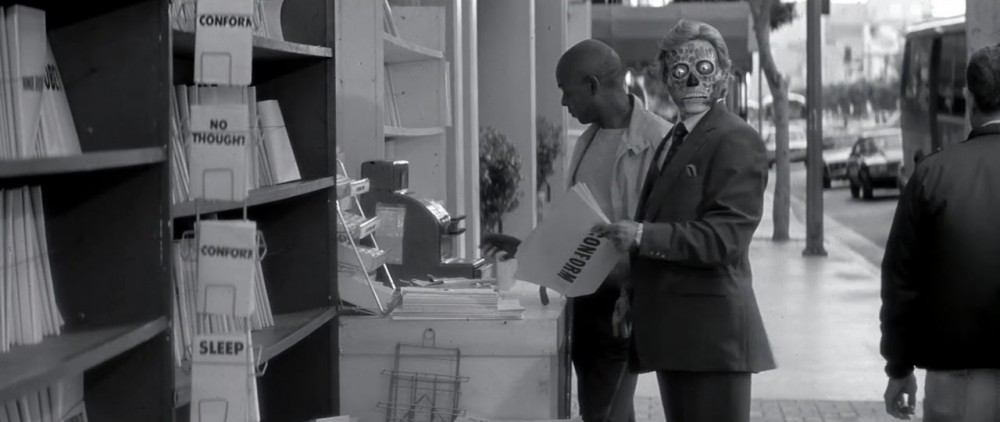 The Future. Unemployed drifter ‘Nada’ (Piper, 33) has wound up in Los Angeles and managed to snag grunt work job on a construction site. Fellow working stiff ‘Frank Armitage’ (Keith David, 31) tips Nada on basic digs at a shantytown next to a church. Some mysterious activity around the church, coupled with repeat jamming of TV broadcasts by unidentified people raising cryptic social alarm, is followed by a brutal police sweep that destroys the settlement and raids the church. Nada avoids the melee but has found something astonishing that reveals something horrible: a special type of sunglasses that when worn show that many members of the population are actually a type of hideous alien, posing as humans with the intent to enslave the population, loot and dominate the planet, with the changing atmosphere turning into one more hospitable for their specie. Nada tries to alert ‘Holly’ (Meg Foster) who works at a TV station, and convinces skeptical Frank to ‘see the light’, and join him in taking up arms against the demonic invaders. Patience and bubblegum supply exhausted, Nada’s smiting of butt-ugly buttocks commences with extreme prejudice.