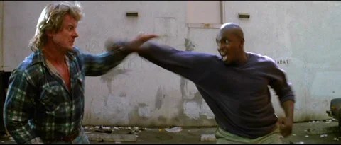 Carpenter stages an action highlight between Piper and David, a crunching five-and-a half-minute alley brawl that results when Nada ‘convinces’ Frank to put on those glasses and see the truth behind the dream scheme. Total guy-movie fight fun, modeled on the classic bout in The Quiet Man. That no one could walk away from it alive is beside the point.