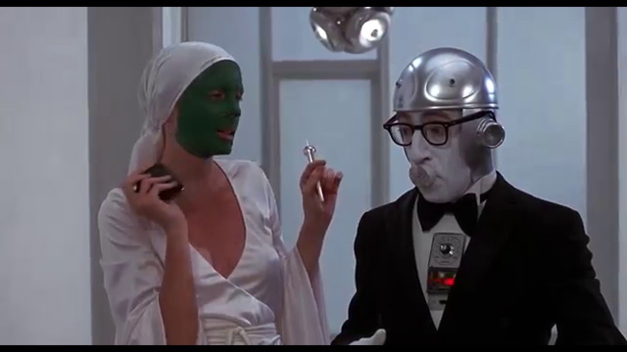 In the year 2173, scientists revive a man from a 200-year state of cryopreservation. ‘Miles Mander’ (Allen), once the owner of a health food store (the ‘Happy Carrot’) in Greenwich Village, awakes to discover the future USA is a police state (laugh while it’s still legal), and he’s soon pursued by security forces of ‘The Leader’, who think he’s part of a rebellion. He disguises himself as a robot butler, and is delivered to home service for airhead socialite ‘Luna Schlosser’ (Keaton), who he kidnaps after she discovers his identity. On the run, they fall for each other (duh), and both eventually join the rebellion.