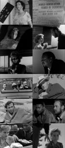 The War—THE war—is over. An ‘improved’ type of everyone-bomb has left structures undamaged, decimating the population, only skeletons left behind. Wandering in shock, a lone woman (Susan Douglas) makes it to a relative’s hillside retreat near the coast (we presume California) to find a stranger living there. He’s ‘Michael Rogin’ (William Phipps) and she is ‘Roseanne Rogers’, married but almost certainly widowed. She’s also pregnant. Presently they encounter ‘Charles’ (Charles Lampkin) and older, somewhat unsteady ‘Oliver’ (Earl Lee), co-workers at a bank who were locked in the vault when “it” happened. Michael had been in an elevator at the Empire State Building; during his cross-country trek he’d seen no one else, alive. Roseanne was in a hospital’s x-ray room, lead-lined. They assume their circumstances and locations had left them untouched by fallout. The amiable quartet make a determined go of it until Earl sickens, radiation having found him. Then they find a fourth man, washed up on the beach. A foreigner (European, unspecified) he’s made it across the Pacific from Asia. ‘Eric’ (James Anderson) had been stranded in a blizzard on Mt. Everest, saved by isolation and altitude. Arrogant and dismissive, Eric is remote in another way, racism: he does not care to associate with Charles, who is African-American. The group, eventually joined by Roseanne’s baby, surmises there must be others alive somewhere: their new arrival makes it painfully clear that age-old human flaws haven’t died out, either.