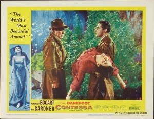 THE BAREFOOT CONTESSA—-“Nothing could have helped. The moving finger had already writ and moved on. And nothing I could do would have cancelled half a line.” So says ‘Harry Dawes’, a seen-it-all Hollywood writer/director in one of his narration overlays. He splits voiceover duty with ‘Oscar Muldoon’, a used-’em-all Hollywood press agent. Said-it-all Hollywood writer/director Joseph L. Mankiewicz managed to let alter-ego(istic) ‘Harry/Joe’ self-analyze/critique himself with a three sentence, 24-word combo synopsis/review of his (Joe’s) 1954 drama using Harry’s weary intoning: did script parentheticals read “Harry intones wearily”? Harry, Oscar and others in the story may as well have been named & addressed as their assorted ‘__-it-all’ types. The actors vie for truth-foothold supremacy with a screenplay where every other statement more complicated than “Hello” comes off like a pronouncement, a ‘pretentionment’. JLM worshipers will snipe “Heresy!” Those less triggered to genuflect might riposte “Like a baby who needs a light on in the dark, I need to be loved when I’m hiding in the dirt – and afraid.” To be intoned, wearily, while lighting up a cigarette or putting down a drink, presumably cognac or scotch. Cue reflex Academy Award nominations.