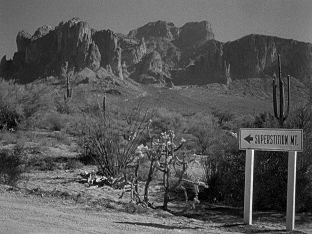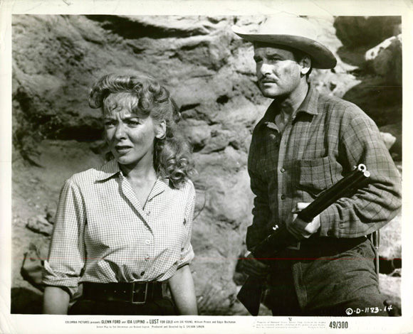 In modern-day Phoenix (circa the mid 1940’s, when there were about 65,000 people there) a man named Barry Storm (William Prince) notifies the local lawmen that he was aware of a recent murder of a prospector in the nearby Superstition Mountains. The victim was after the ‘Lost Dutchman’ mine purportedly found a hundred years earlier; Storm is on hand because his grandfather had once staked a claim to it. The framing device set down, a flashback takes over and the story moves to 1880, with German immigrant prospector Jacob Walz (Glenn Ford) murdering men who had re-found the mine; he then kills his own partner. Walz’s newly found/stolen wealth enthralls/ticks off the nearby burg of Phoenix, and among those intrigued is bakery owner ‘Julia Thomas’ (Ida Lupino), fed up with her weak husband (Gig Young) and a life stuck baking cakes and cookies. She sets out to seduce Walz. Double-crosses are part of the gold lust, though. So are guns.