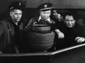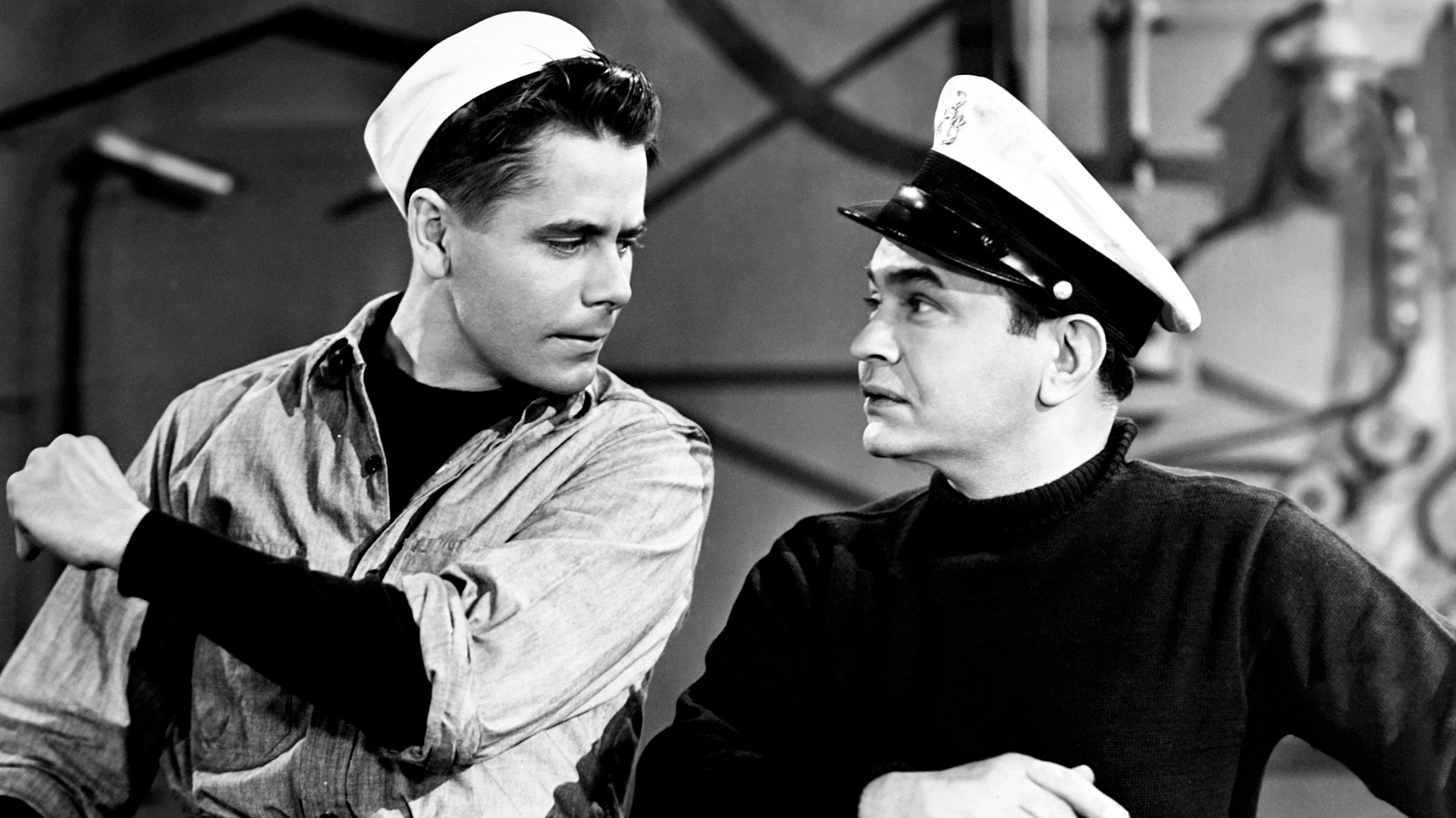 Former sailor ‘Steve Boleslavski’ (Edward G. Robinson, 48) quits his job as a welder in a shipyard after helping put together the new destroyer ‘USS John Paul Jones’ and signs up to go back into action as one of the crew. He gets his old rank back, but as Chief Bosun’s Mate he irks fellas the wrong way—until the chips are down (cuz it’s a movie and there’s an Axis to grind), when he helps rally the crew during an engagement with Japanese aircraft and a sub. That’s after 4/5th of the running time: first he has to butt heads with ‘Mickey Donahue’ (Glenn Ford) who’s made time with Steve’s daughter (Marguerite Chapman) in the requisite romantic blah-blah shoehorned in for an added plot point. And the ship has to get past the idea that it’s jinxed. Plus, what would an old war pic be without a guy named ‘Kansas’? He’s played by Edgar Buchanan, one of 13 times he worked with Ford.
