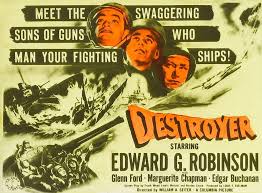 DESTROYER plowed its way into the wave of win-the-war flicks that assaulted screens in 1943, with this enlistment booster pitched in its ad campaign as “Sentimental! Human! Thrilling!” The range of WW2 movies made during the conflict reflected its breadth by taking a United Nations approach, telling stories set in other countries to show the predicament and resolve of our allies, and by honoring the various branches of our armed services. There were enough available to extol familiar (‘popular’ not quite right) weapons—planes, tanks, aircraft carriers, PT boats, submarines and in this case the Navy’s workhorse vessel, described as “a fast, maneuverable warship.” They were fast thanks to light armor, for which sailors nicknamed them “tin cans”. *