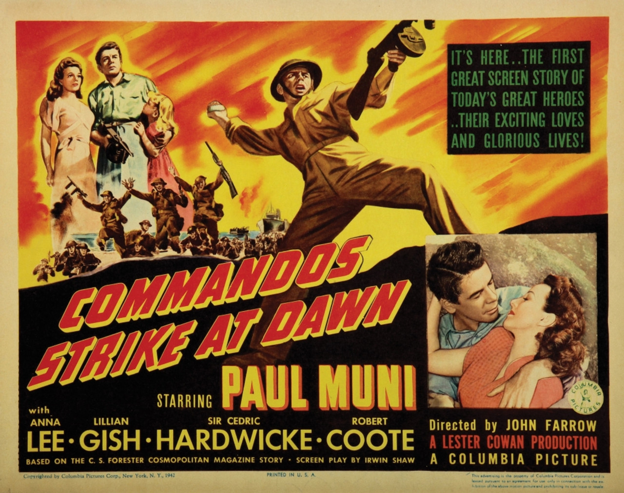 COMMANDOS STRIKE AT DAWN arrived at the end of 1942, one of the year’s flurry of ‘fight back’ movies. They took place in embattled England and China, occupied France and the Philippines, and Axis-threatened Morocco (Casablanca) and Panama.This one, with a screenplay by Irwin Shaw off a C.S. Forester short story, was set in Norway. Forest and inlet locations in British Columbia served ably, with branches of the Canadian services lending ample support of troop and equipment. Though the catchy title did obvious publicity duty for emergent specialist outfits like Britain’s commandos and the US Rangers (the former figuring in the slam-bang climax), the heart and soul of the story was a salute to the valiant civilian resistance offered by the Norwegian people. *