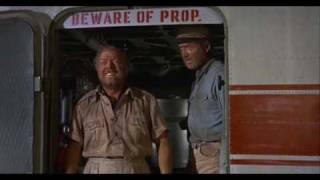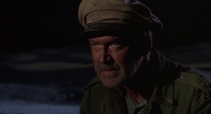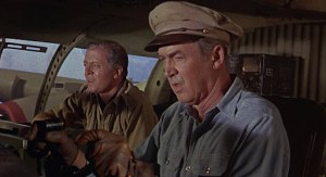Marvelous casting. For Stewart, 57, this joined with the year’s more popular Shenandoah as his top line work in the latter end of his career, conviction assured by his own experience as a pilot. Attenborough, 42, was on a roll of vivid performances (The Great Escape, Seance On A Wet Afternoon, Guns At Batasi, The Sand Pebbles); he has a breakdown scene of emotionally exhausted hilarity that’s priceless. Matching him is the focused intensity of Hardy Kruger as smugly acidic ‘Heinrich Dorfmann’, who may hold the key to salvation—if he doesn’t irritate everyone enough to bash him senseless. Peter Finch excels as the quietly reassuring Brit officer ‘Capt. Harris’, saddled with lout sergeant ‘Watson’ (Ronald Fraser), who’s almost as much trouble as eruptive mental case ‘Trucker Cobb’ (Ernest Borgnine). Sarcasm vents from cheerfully nasty ‘Crow’ (Ian Bannen, 37, nicking the Oscar nomination for Supporting Actor) and their are stalwart turns from Christian Marquand, Dan Duryea and George Kennedy, each of them likable and sympathetic to balance out the hard cases.