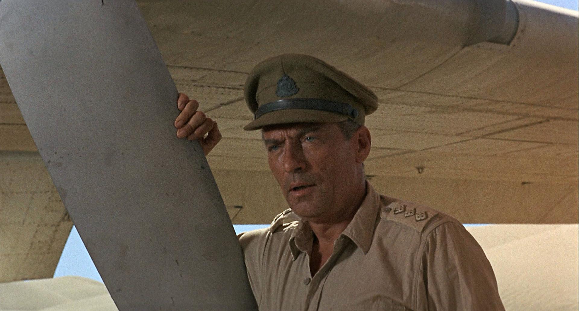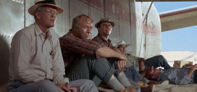 Libya. A cargo plane, crew of two, twelve passengers, flying from remote oasis Jaghbub to Benghazi, hits a sandstorm. Off course, engines knocked out, radio blinked, veteran pilot ‘Frank Towns’ (James Stewart) manages to crash land in the vastness of the Saharan dunes, two men perishing in the wreck. So now Towns, his friend and shaky navigator ‘Lew Moran’ (Richard Attenborough) and the other eight have to figure out how to survive. Ration water, as long as it will last. Stay put? March out? Or…is there a daft hope of somehow reconstructing a new plane from what’s left of the old one? Situation, logistics, and personalities play into the chances of staying alive.