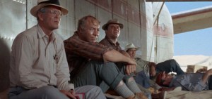 Keen on stories that pit complex characters against vexing dilemmas, and not one to gild his tale telling with false sentiment or easy outs, Aldrich came off successful actress-centric melodramas Whatever Happened To Baby Jane? and Hush…Hush, Sweet Charlotte to wrestle in the sand with a men-against-the-elements epic. Just one female cast member is present: Barrie Chase as a belly dancer, viewed for a little over one minute, imagined in a hallucination by one of the men. Lukas Heller’s superb screenplay was adapted from Elleston Trevor’s 242 page novel, with the director and his cast fine-tuning Heller’s work to best fit their skill sets vis-à-vis the disparate and desperate men they were picked to portray. Aided by literally blistering work from the makeup team, the harrowing saga had Joseph Biroc as cinematographer, shooting mostly in southern California’s handy Algodones Dunes, an erg 45 miles long and six wide next to the Arizona/Mexico borders. **