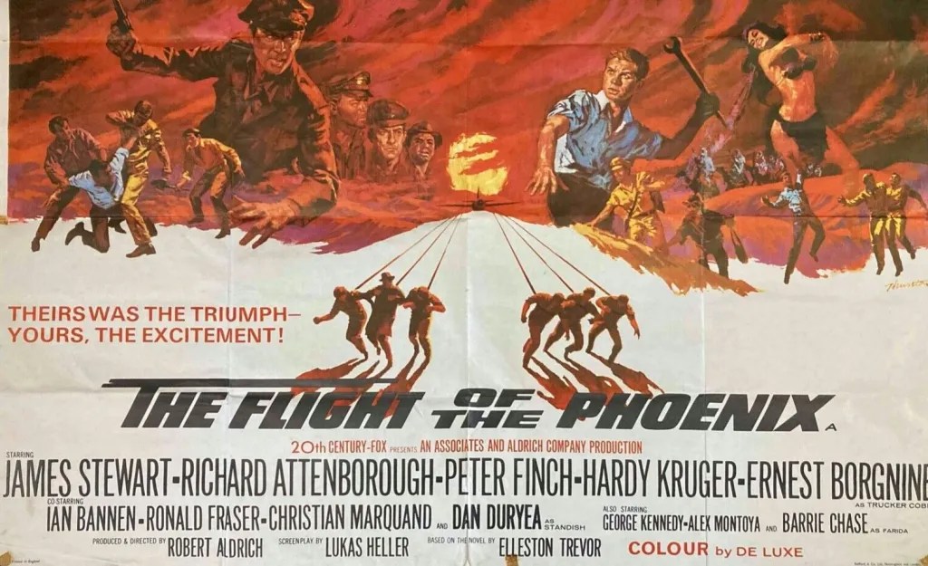 Notably and on a tragic note, famed movie stunt pilot Paul Mantz was killed during the shoot when doing practice runs with the ‘Tallmantz Phoenix P-1’, the aircraft designed for the story’s cobbled-together escape hope. The picture concludes with the honorific “It should be remembered… that Paul Mantz, a fine man and a brilliant flyer gave his life in the making of this film…”