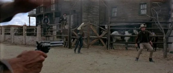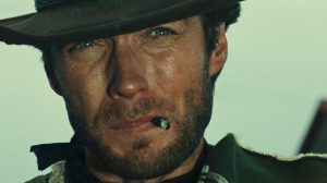The Mexican town of ‘San Miguel’ near the US border, is run by competing gangs of smugglers, two families that—when not decimating each other and abusing the hapless citizens—play off the government cavalry and that of the Americanos against one another, running guns to tribes and allied outlaws who fight with both. A gringo stranger (Clint Eastwood)—later identified only as ‘Joe’, but whether that’s accurate is iffy—shows up, easily plugs a slew of slimes in a gunfight, and proceeds to try and deal with both factions. Joe survives a beating that would maim a brontosaurus, the casualty count reaches wipeout level, and eventually the worst of the baddies, psychotic bastardo ‘Ramón Rojo‘ (Gian Maria Volonté) will learn the impact differential between a Winchester and a Colt. 45. El hard way.