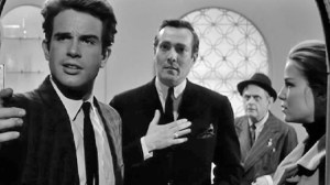 MICKEY ONE is unfortunately not a Mantle, Rooney or Mouse situation, the kind that brings you to your feet with a switch-hit home run, dazzles with innate chutzpah from a pint-sized dynamo or provokes tossing out poisoned cheese after an ethics lesson from a cheerful rodent. Instead,temples are rubbed over the case of a Beatty, Penn & Surgal (no, not a bill-boarded personal injury law firm) aping of French New Wavy angst about corrosive Capitalism, fragmented individualism, the ego-creed complex, and who knows what else?—cue the sum-up from Warren (star) about Arthur’s (director) wrestle with Alan’s (writer) fever-dreamed theme teem: “We had a lot of trouble on that film, because I didn’t know what the hell Arthur was trying to do and I tried to find out. I’m not sure that he knew himself.” Now you tell us. Hang on for S.O.L. on steroids in black & white closeups, a gallery of in-your-face grotesques deliberately designed to be off-putting (thus securing niche appeal with some) in 93 minutes that are just one Mickey from a platoon of joy kills that assaulted 1965. *