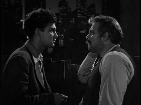 There is ample good dialogue, though the handling of it varies. Cobb (just 27, made up to look 50) lays on an ‘earthy’ Italian accent as the Papa: it may have seemed fresh and vital at the time but comes off close to caricature today. He’s outdone (outshouted) by the even hammier Sam Levene, as the husband of Joe’s sister: every time Levene gets near a line he belts it so it can be heard across the nearest border. As Moody’s right-hand man, Edward Brophy is also on the rambunctious side but at least he’s entertaining. Much better is confidently dangerous Calleia (he nicked another plum role that year in Five Came Back) as the shark-like hood. Menjou’s in good form. Holden, while a mite green, is impressive: his rough edges were rapidly polished off thru his subsequent work in Our Town, Arizona and Texas. Best of all, as in many other properties that she boosted a notch, is Stanwyck, whose naturalism is present in every gesture, expression and speech. **