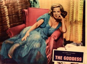 THE GODDESS, according to the man who wrote it, Paddy Chayefsky, was not based on Marilyn Monroe. Ignoring his denials hasn’t kept decades of reviewers and casual movie fans (those who’ve actually seen it) from believing its life victimized rural waif turned idolized star—‘Emily Ann Faulkner’ becoming ‘Rita Shawn’—isn’t really a disguised MM, or the second most popular guess, Ava Gardner. Both iconic sex symbols were alive (and if not kicking, than certainly writhing) when the 1958 fictive bio-drama was released; the insecurity crushed character could stand for any number of show biz casualties. Critics clapped, but the box office bombed, an unfamiliar stage actress in a depressing story. Chayefsky’s observant if overloaded screenplay drew an Oscar nomination. Who should have been on the nominee list was Kim Stanley, a Broadway & live TV success in her feature debut. Longtime studio veteran John Cromwell directed. *