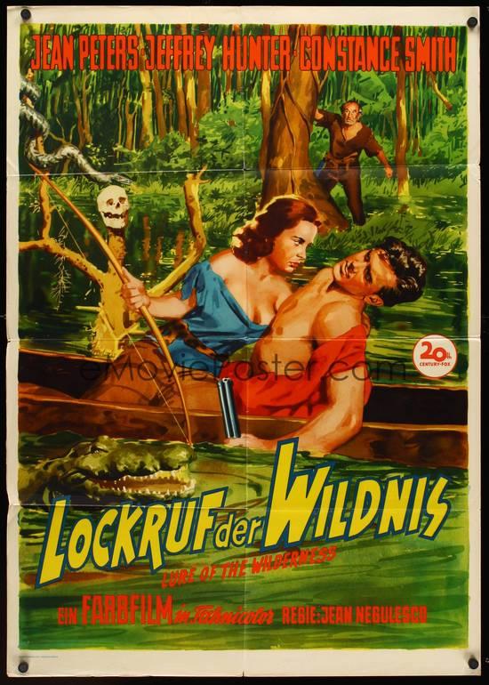 LURE OF THE WILDERNESS drew sufficient audiences to make it 1952′ 48th most attended picture, a gross of $5,600,000 ensured by attractive young stars, a grizzled older pro and a solid storyline, remaking 1941’s Swamp Water, making some non-hurtful alterations to the plot and adding Technicolor. Like the excellent original, most of the shooting was on location in Georgia and Florida, chiefly in the Okefenokee Swamp. Like the earlier script done by Dudley Nichols, this new version from Louis Lantz was based on Vereen Bell’s novel. Walter Brennan repeated his role from before, and the fresh faces who figured in ’41 (Dana Andrews and Gene Tierney) were now belonging to Jeffrey Hunter and Jean Peters. Romanian-American director Jean Negulesco may not have won over critics as much as temporary French exile Jean Renoir, but his background as a painter gave a stylistic imprint to his work: it’s interesting that such an evocative slice of Americana was so well captured by artisans who came from abroad. Perspective played to win. *