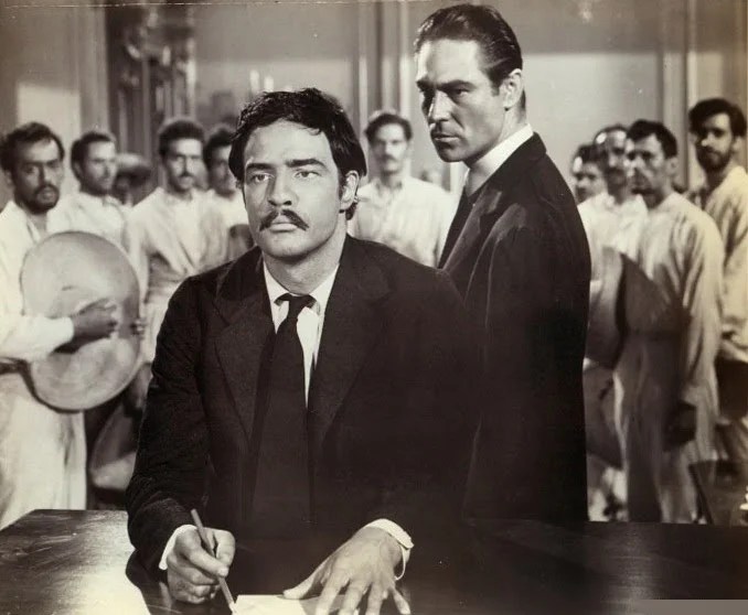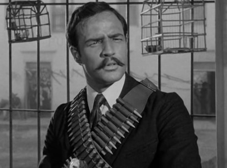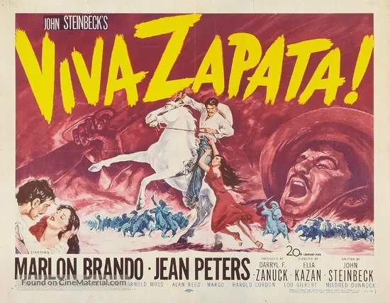 Numerous sources say Steinbeck based the script on Edgecomb Pinchon’s 332-page 1941 book “Zapata The Unconquerable”. Edgecomb also wrote the book that the 1934 hit Viva Villa! was based on, for better or worse. However, Steinbeck, fluent in Spanish, had studied Zapata for years and traveled into Morelos to extensively interview people who knew him and had written his own book—“Zapata”— on the man, later published along with his screenplay. He’d wanted Pedro Armendariz to play Emiliano. While nine actors have covered colorful Pancho (Beery the most famous, others include Armendariz, Yul Brynner and Antonio Banderas), Zapata has been done by four others besides Brando: Antonio Aguilar in 1970s Emiliano Zapata, Alejandro Fernández in 2004’s Zapata: el sueño del héroe directed by Alfonso Arau (and terribly reviewed), Demián Bichir in the 2004 mini-series Zapata: Amor en rebeldía and Tenoch Huerta in a 2011 Mexican series El Encanto del Aguila. A Huerta playing a Zapata!?