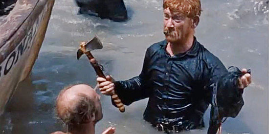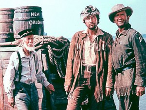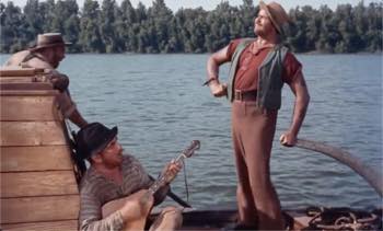 DAVY CROCKETT AND THE RIVER PIRATES was stitched together from Walt Disney’s Crockett TV faves, made as a two-part prequel to the third episode had which left Davy at the Alamo, swinging his musket into glory and legend. Like the first three episodes shown on the telly in 1954 and edited into a feature release the following year, this came out a year after that; in 1956 enough of the banzai Crockett craze was still going to see it make $2,100,000 and place 135th among the mass of releases. Star/Davy/instant icon Fess Parker was also in two other Disney features that year: Westward Ho, The Wagons! and The Great Locomotive Chase were both popular, doing even better biz than the Crockett tale. Buddy Ebsen was back as loyal pal ‘Georgie Russell’. Kenneth Tobey, who’d been killed off as Jim Bowie in the Alamo segment, was on hand again, this time playing for laffs. His part as a rowby boatman is secondary to the one going to frontier he-bull Mike Fink (1775-1823), played to the rafters—and kids delight—by big ‘n’ brawny Jeff York.