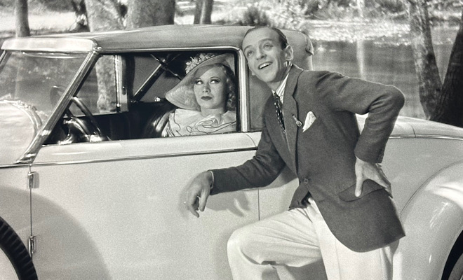 * Split decisions—Astaire, Rhodes and Blore recreated their roles from 232 performances of the 1932 Broadway musical Gay Divorce, with songs from Cole Porter (only “Night And Day” was used in the movie). Besides the three credited screenwriters, pitching in on the sly were Robert Benchley, H.W. Hanemann and Stanley Rauh. That 1929 Duesenberg Model J that Ginger sports about in was her own car.