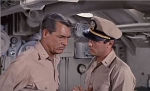 * Depth charges—scan the lit on this fondly-recalled flick and one fish tale that comes up like bad crab is that Tony Curtis enlisted in the Navy (he forged his mom’s name and joined when he was not yet 17) because he’d seen his idol Cary Grant playing a submariner. Curtis threw this jive around a lot, and lazy reviewers too frequently don’t do their homework. He went into the Navy in September of 1943. Destination Tokyo didn’t come out until the last day of that year. Tony did crew in a sub tender and is said to have been present in Tokyo Bay for the Japanese surrender. Tony admired Cary, Cary liked him: after The Defiant Ones and The Vikings Curtis had some clout, Grant was amenable (this could banish the bad taste of his earlier Navy comedy, the dud Kiss Them For Me) and Edwards, flush from TV success, was primed for a big-screen breakout. Curtis was on a roll—Some Like It Hot was #5 (and included his great Cary impression). Grant played his cards particularly well; he shrewdly negotiated his contract in such a fashion that he ultimately made a record three million smacks off the film, which ranked at the tip top of his box office winners. It didn’t hurt that also aced a classic that year; North By Northwest was #7.