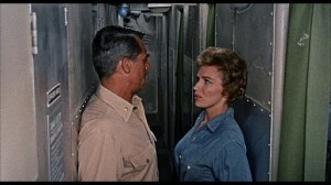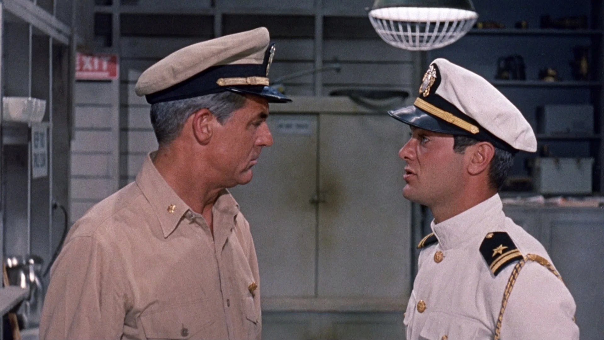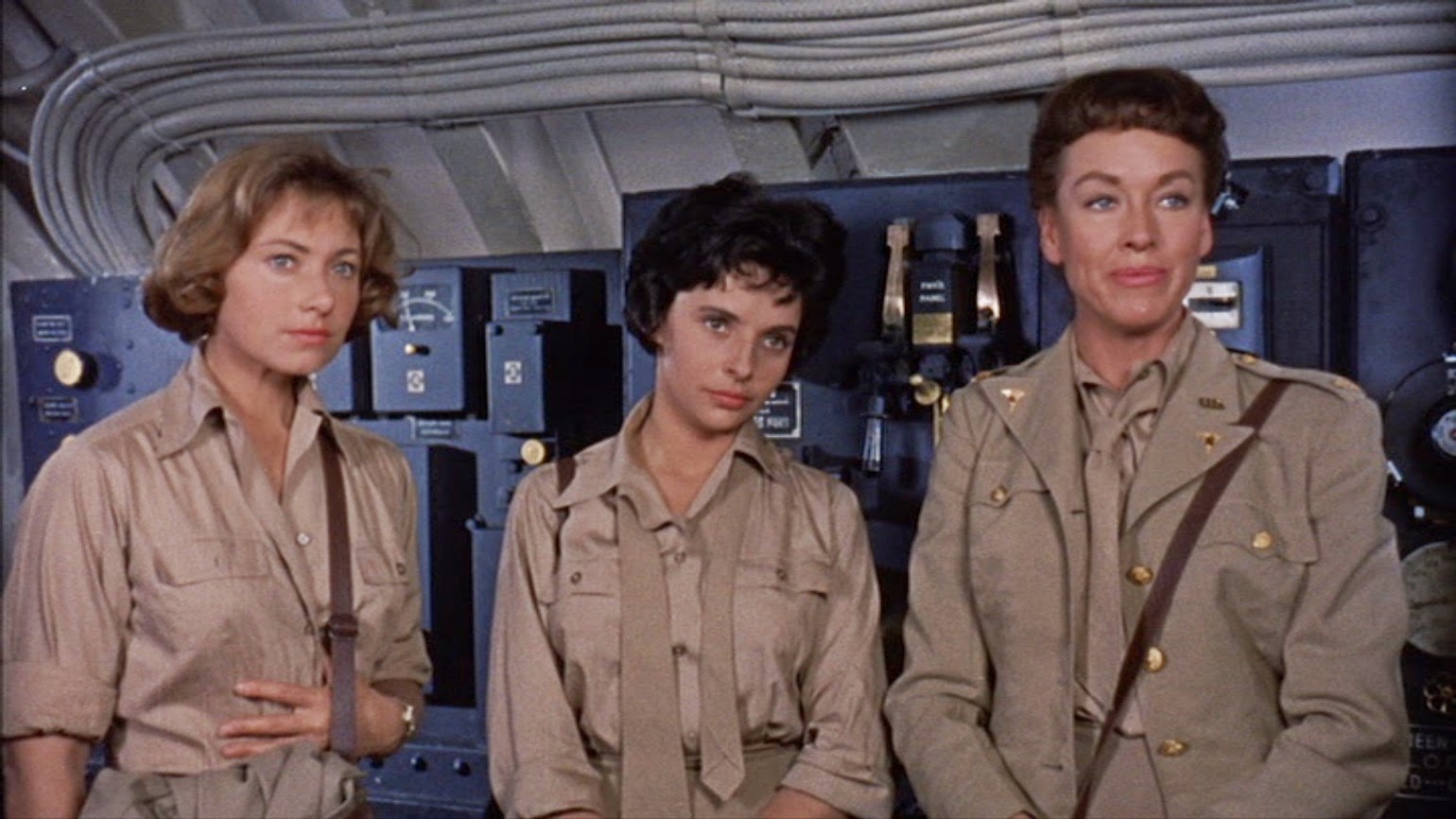 Cheeky fiction with a few elements lifted from actual events, the story, with bookend sections taking place in 1959, is set in December of 1941. The damaged submarine ‘USS Sea Lion‘ (played by three WW2 era subs), hoping to evacuate from the embattled Philippines to Australia, is pressed into impromptu rescues. Veteran ‘Lt. Commander Matt Sherman’ (Grant) is dismayed to have inexperienced junior grade Lieutenant ‘Nick Holden’ (Curtis) as a replacement officer. But as the patched-up, creaky vessel manages to (a) stay afloat and (b) evade the conquering Japanese, the slick newcomer proves masterful at scrounging needed material. He also plays jockey to relations between the crew and their surprise guests, first a team of five Army nurses, then a gaggle of civilian women and kids. Not enough that Zeroes strafe them, a US destroyer depth charges them as well. A skewed paint job results in Sea Lion being given a pink coating, then when it tries to sink an enemy ship its torpedo goes off course, runs ashore and blows up a truck. Messed up paint jobs did happen and the real USS Bowfin accidentally managed to clobber a bus. In Operation Petticoat the torpedo sinks a truck thanks to the clumsiness/vavoomage of ‘Lt. Crandall’ (Joan O’Brien, 22) whose nature-blessed figure accounts for many of the innuendos littering the screenplay. Once again playing a sub commander, as he had in sixteen years earlier in the decidedly more serious hit Destination Tokyo, Grant, 54, takes it all in suave stride, getting the movies best laughs with some deceptively simple, elegantly timed and delivered expressions. He also gets paired up with (er…against) O’Brien, while Curtis, 33, is tasked to put the moves on Dina Merrill. **
