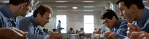 In January of 1960, recidivist burglar Frank Morris (Eastwood), who has escaped from lockup before, is transferred to the fortress-like Federal pen on the rocky island of Alcatraz, where occasional views of San Francisco, the sea and sunsets don’t compensate for the spirit-crushing atmosphere of the prison. Fending off assaults from a hulking sexual predator, enduring an undeserved spell in cruel solitary confienment and bridling under repeated taunts from the pitiless warden (played with studied chilliness by Patrick McGoohan, warming up for his crown royal bastard in Braveheart) Frank makes up his mind to find—literally carve—a way out.